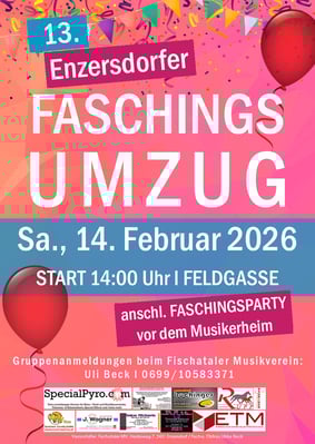 Am Faschingssamstag, den 14.02.2026 findet wie jedes Jahr unser Fischataler Faschingsumzug in Enzersdorf statt!